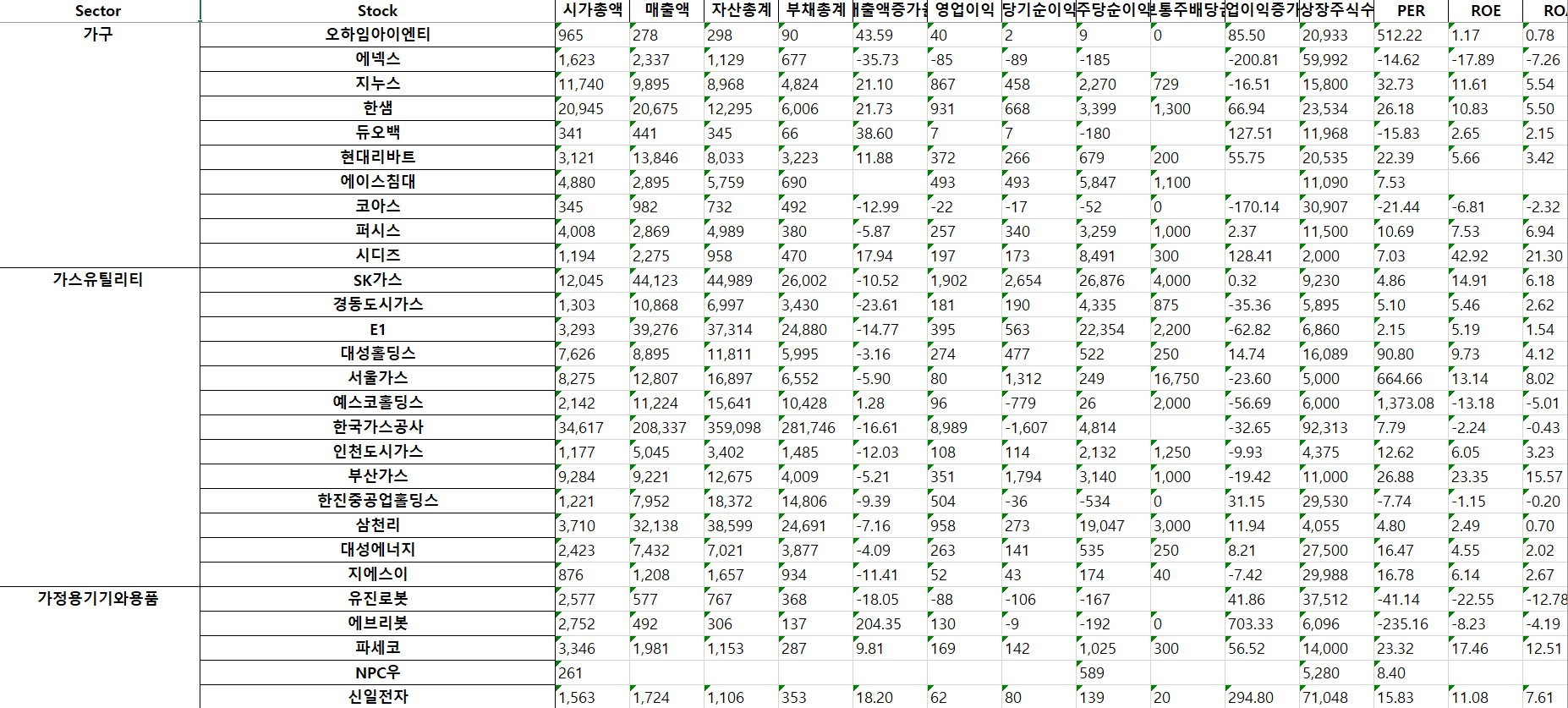 시가총액 매출액 자산총계 부채총계 ... ROE ROA PBR 유보율