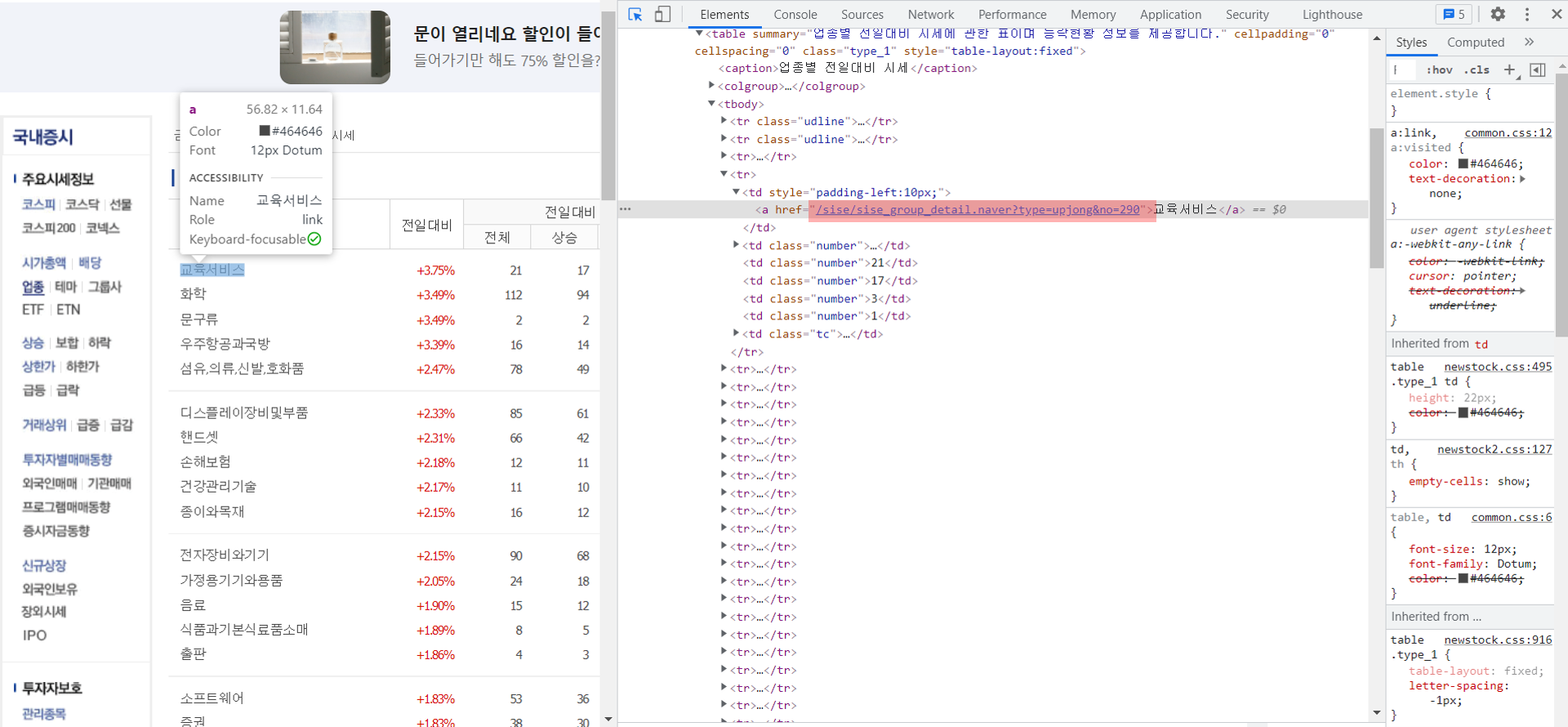 개발자 도구를 열어 링크가 걸린 업종 이름을 보면 html 구조 내부에 해당 업종으로 이동하는 주소가 "tbody" 태그 아래의 "a" 태그에 들어있는 것을 확인할 수 있다.
