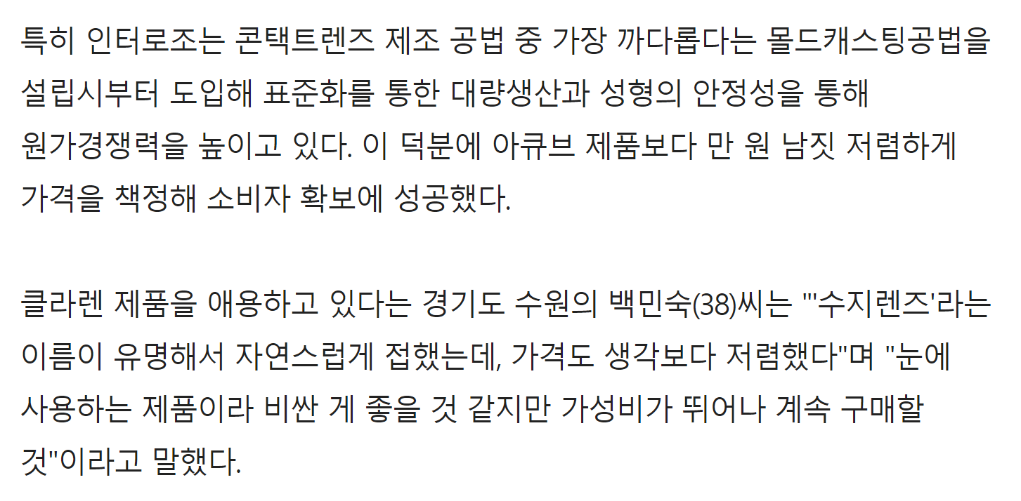 인터로조 콘택트렌즈 제조 판매 및 ODM 기업, 국내에서는 자체 브랜드 클라렌 시리즈, 해외는 ODM, OEM을 중심으로 사업을 영위 제품은 크게 색상에 따라 Clear Lens와 Color Lens로 나뉘며, 착용 주기에